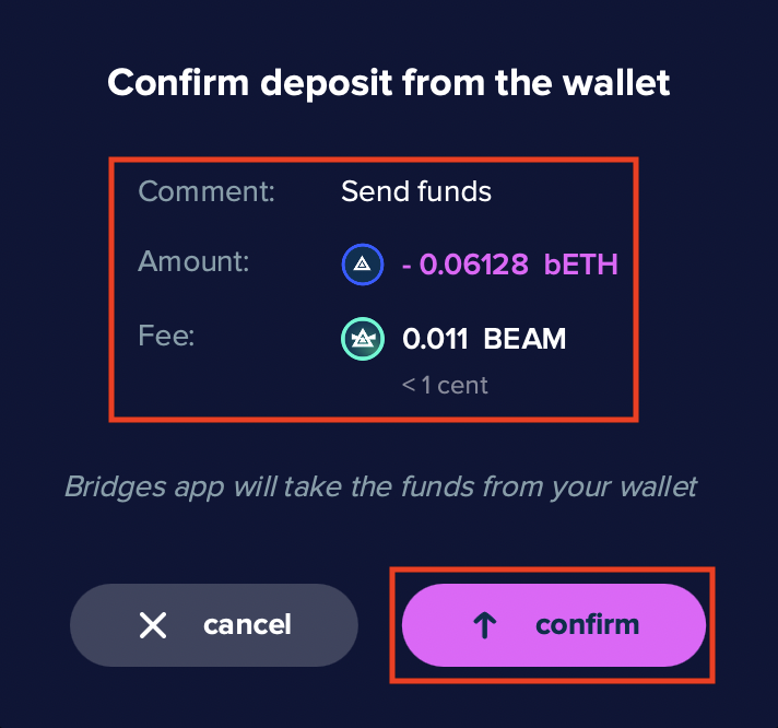 - Verify the transaction details. "Confirm transfer". If no human or technical error occurred, the transaction will appear in both Beam and MetaMask wallets!